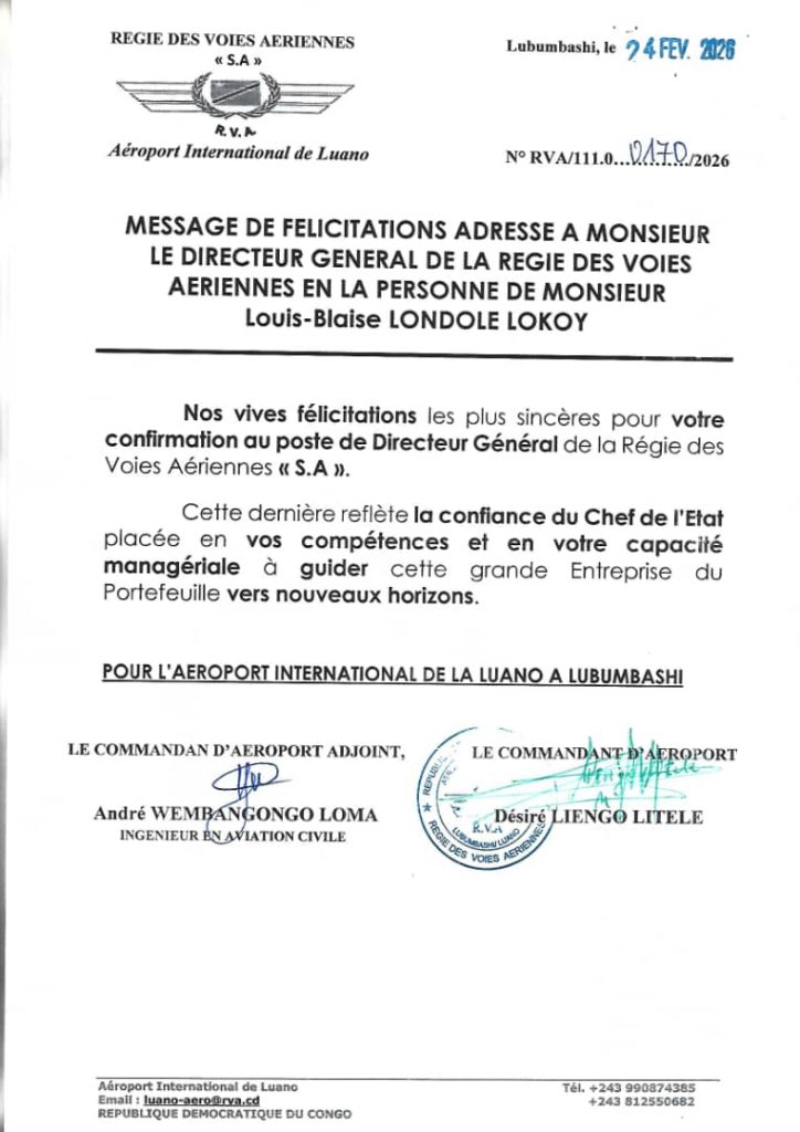 Au nom de tous, nous vous souhaitons plein succès dans vos hautes fonctions, confiants que votre cap, clair et exigeant, continuera d’ouvrir des horizons prometteurs à la Régie des Voies Aériennes. Ci-dessous le message de félicitations de la RVA/LUANO Adressé au Directeur Général